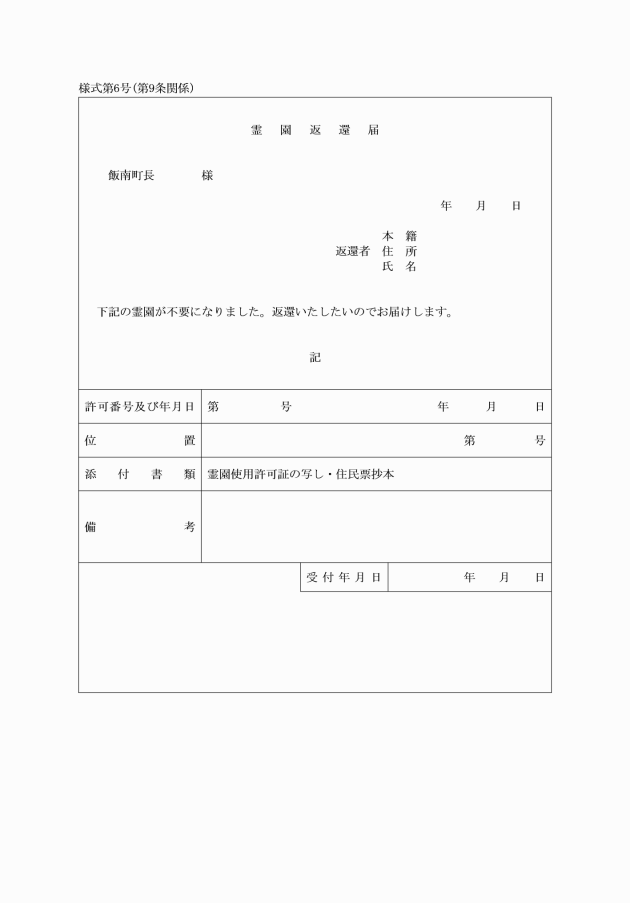 第4条 霊園の使用者が町外に転出しようとするときは、町内に居住している者を管理人と定め、霊園管理人設置届(様式第3号)を町長に提出しなければならない。