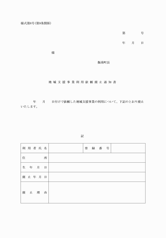 第9条 町長は、利用者が次の各号のいずれかに該当するときには、サービス提供の廃止をすることができる。