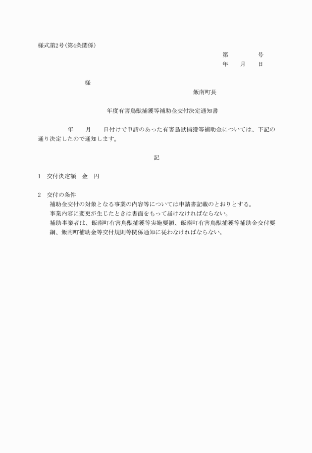 第3条 補助金の交付を受けようとするものは、飯南町有害鳥獣捕獲等補助金等交付申請書(様式第1号)により補助金の交付申請を行わなければならない。
