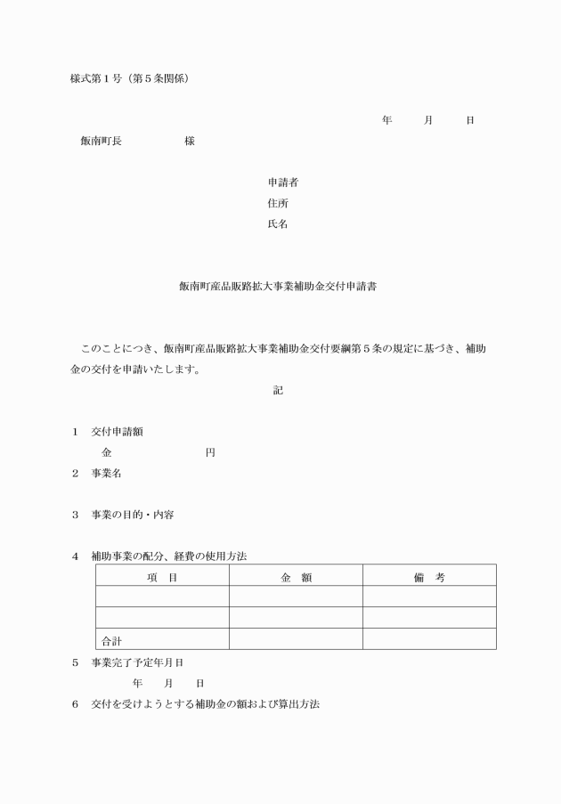 第5条 補助金の交付を受けようとする者は、交付申請書(様式第1号)に、次に掲げる事項を記載し提出しなければならない。