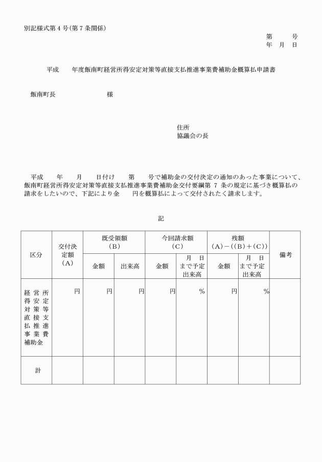 第7条 協議会が、概算払による補助金の交付を受けようとするときに町長に提出する請求書は、別記様式第4号とする。