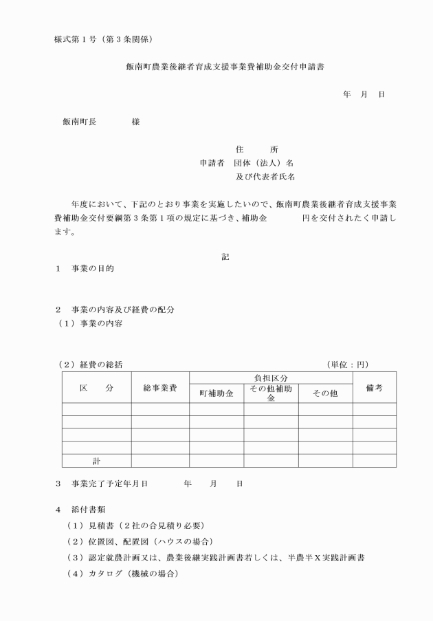 第3条 事業実施主体は、規則第5条の規定により交付申請をしようとするときは、飯南町農業後継者育成支援事業費補助金交付申請書(様式第1号。以下「申請書」という。)を町長に提出しなければならない。提出の期日は、町長が毎年度別に定めるものとする。