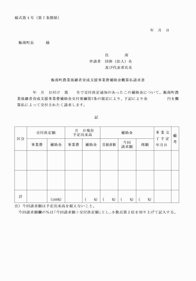 第7条 申請者が、概算払により補助金の交付を受けようとするときは、飯南町農業後継者育成支援事業費補助金概算払請求書(様式第4号)を町長に提出しなければならない。