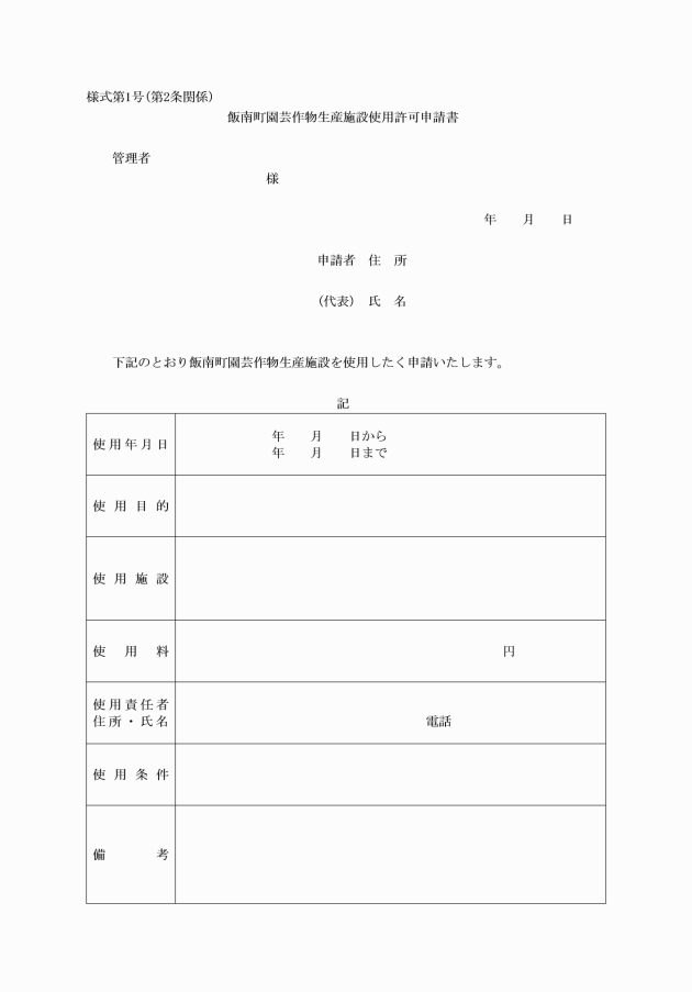 第1条 この規則は、飯南町園芸作物生産施設の設置及び管理に関する条例(平成27年飯南町条例第34号。以下「条例」という。)の施行に関し必要な事項を定めるものとする。