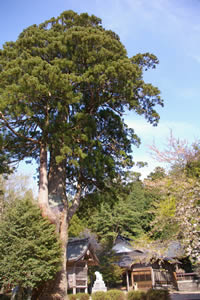飯南町頓原の由來八幡宮境内にある大杉は樹高45メートル、胸高の幹周りが7.7メートルの巨木で、同社の神木となっています。樹齢はおよそ1千年といわれ、ひっそり静まり返った境内に、まっすぐ伸びるその勇壮な姿は訪れる人々に畏敬の念を抱かせます。